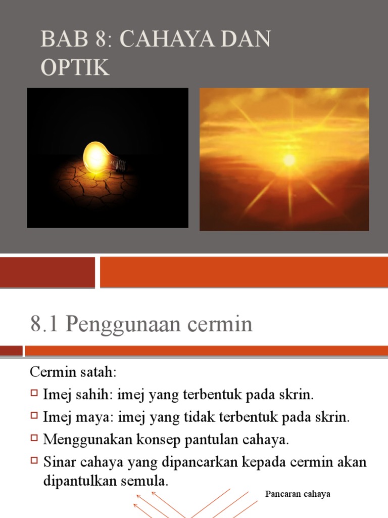 C memantau keselamatan diri di selekoh. Ringkasan bab 8 merangkumi81 Penggunaan Cermin82 Sifat Cahaya83 Pantulan Cahaya84 Pembiasan Cahaya 85 Penyebaran Cahaya86 Penyerakan Cahaya 87.